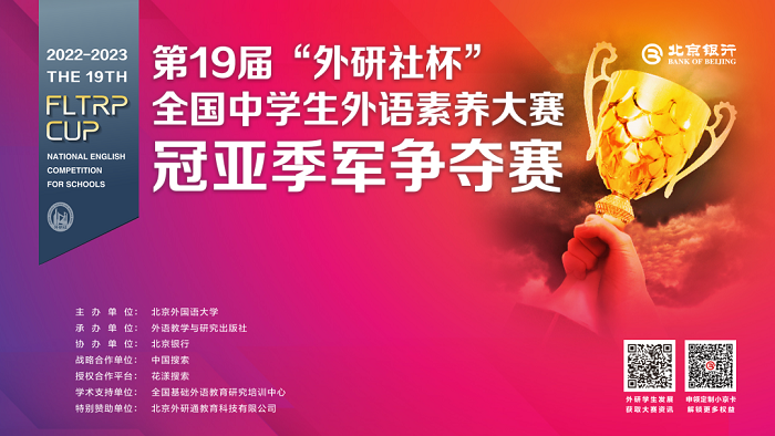 2023年5月13日-14日,由北京外国语大学主办、外语教学与研究出版社承办、北京银行协办的第19届“外研社杯”全国中学生外语素养大赛冠亚季军争夺赛在外研社大厦成功举办。经过激烈的角逐,冠军由济南外国语学校的段令怡荣获,亚军和季军分别由北京交通大学附属中学的兰槿泓和长沙市第一中学的罗楚煊获得。
