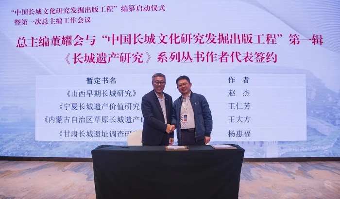 董耀会主持召开专家论证座谈会,与会专家学者就“中国长城文化研究发掘出版工程”编纂工作等内容交流意见和建议;同时,董耀会与“中国长城文化研究发掘出版工程”作者代表山西大学长城文化生态研究院副教授赵杰、绍兴市文物考古研究所研究员王仁芳签约。