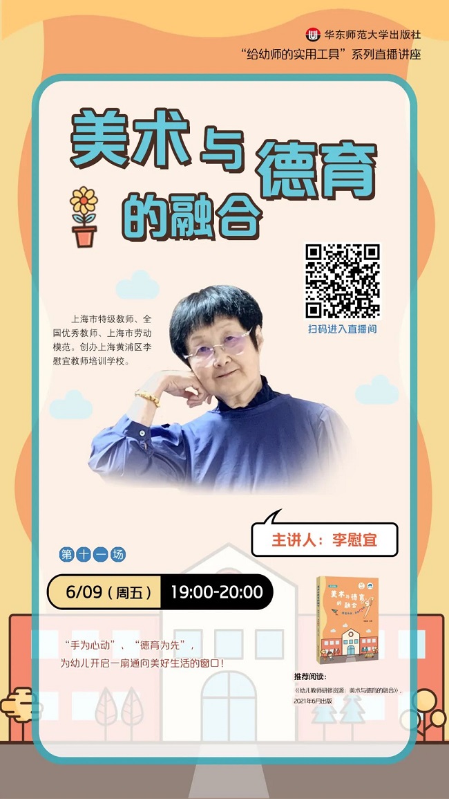 6月9日19:00,李慰宜老师将向读者朋友们介绍《美术与德育的融合》一书中“小小蛋儿把门开”“沙丁鱼风暴”“跨海大桥”等几个经典活动设计与德育目标的达成。此外,李老师还将详细展示近年来围绕幼儿创造性培养的工作坊探索,解读“如何用一张纸做一套家具的方法”“秋沙鸭的幸福生活”“三只蝴蝶”等活动。