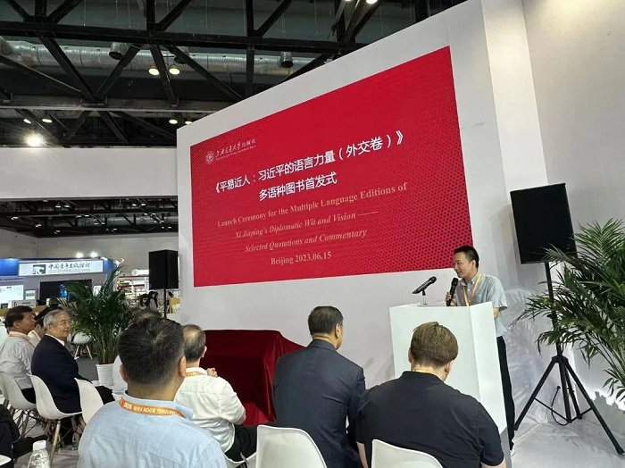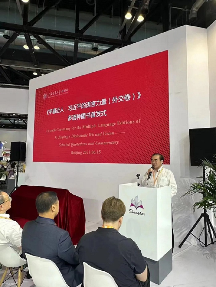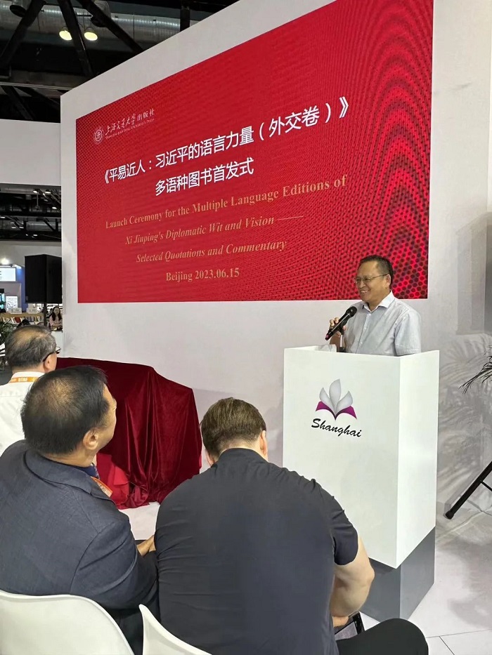 2023年6月15日,在中国出版协会、中国国际问题研究院的指导支持下,由上海交通大学出版社举办的《平易近人:习近平的语言力量(外交卷)》多语种图书首发仪式在第二十九届北京国际图书博览会(BIBF)举办。中国出版协会理事长邬书林,中国国际问题研究院前院长、党委书记苏格,中国新闻出版研究院院长魏玉山,中国出版协会常务副秘书长吴宝安,中国国际问题研究院图书馆馆长沈中明,上海市委宣传部版权管理处处长赵靖,上海交通大学出版社党委书记、董事长钱天东,社长、总编辑陈华栋等出席仪式。首发仪式由陈华栋主持。