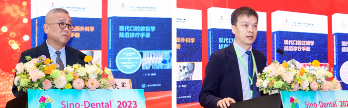 《现代口腔颌面病理学规范诊断手册》主编李铁军教授、《现代口腔全科医学规范诊疗手册》主编江泳教授作为分册主编代表致辞,分别介绍了两个分册的内容特色和出版价值。李铁军教授指出,病理诊断分册对于口腔临床各相关专业均具有很高的参考价值,该书的图片及素材均来自北大口腔病理科多年的积累,是从病理的角度讲述北大口腔的故事。江泳教授认为,口腔全科医学分册的出版对干住院医 师规范化培训具有重要的意义,他还介绍了北大口腔作为全国领先的口腔专科三电医院在口腔全科医学专业建设方面的探索与创新。