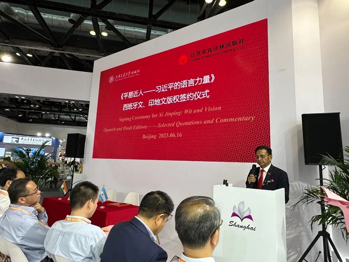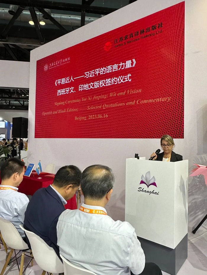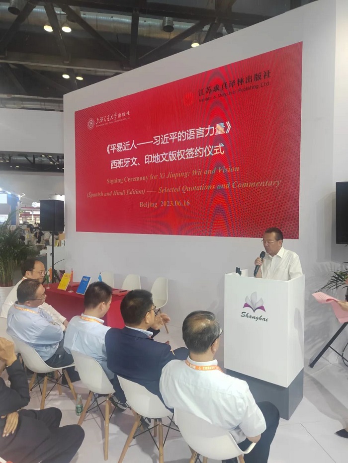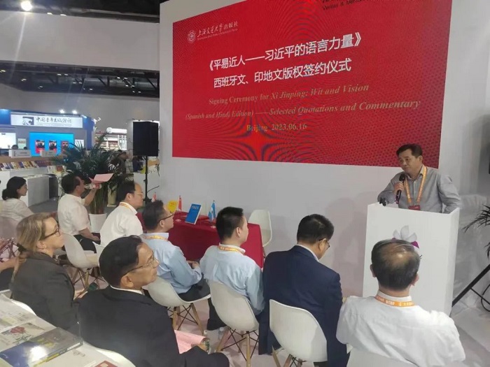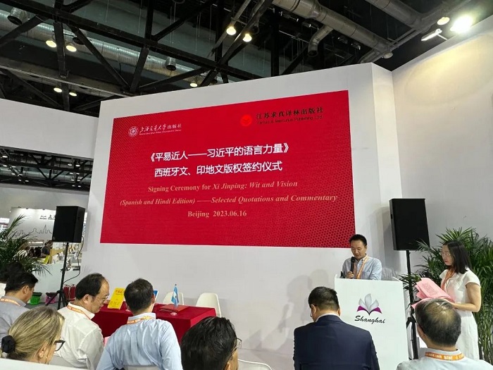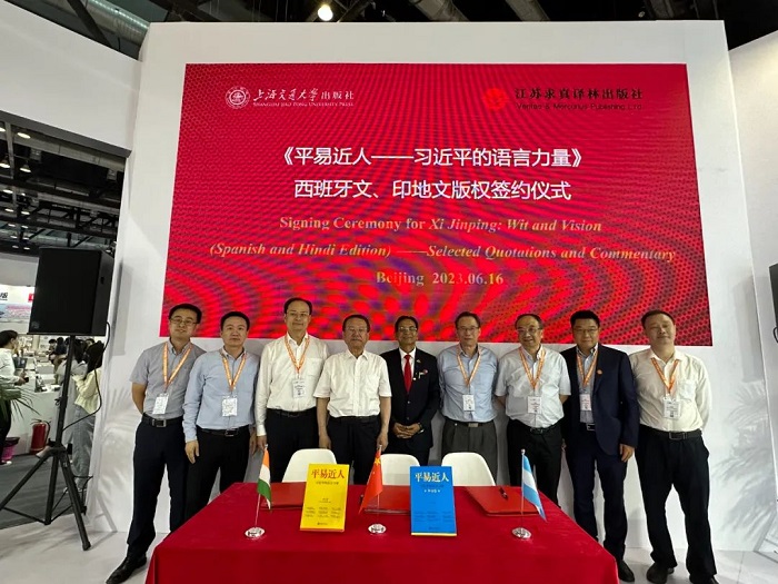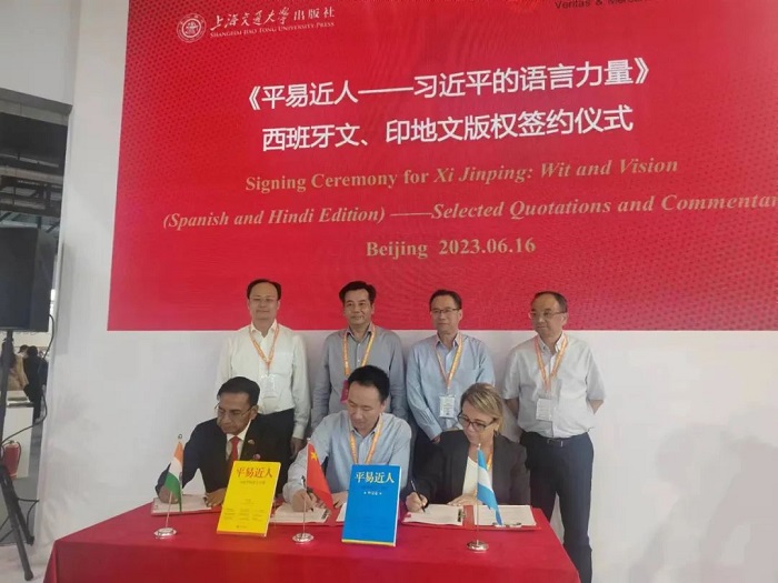在众多领导和专家的见证下,上海交通大学出版社和阿根廷克雷希多出版社、印度通用出版社在2023 BIBF现场进行了西班牙文、印地文版权签约。继不久前《平易近人:习近平的语言力量(外交卷)》8个语种版本在BIBF新书发布后,此次签约仪式上,《平易近人:习近平的语言力量》系列图书再添两个语种版权输出,将让更多的国际读者进一步了解习近平总书记独具特色的语言魅力,以及语言特色中蕴含的中国文化、治国理念、深邃思想和语言力量。