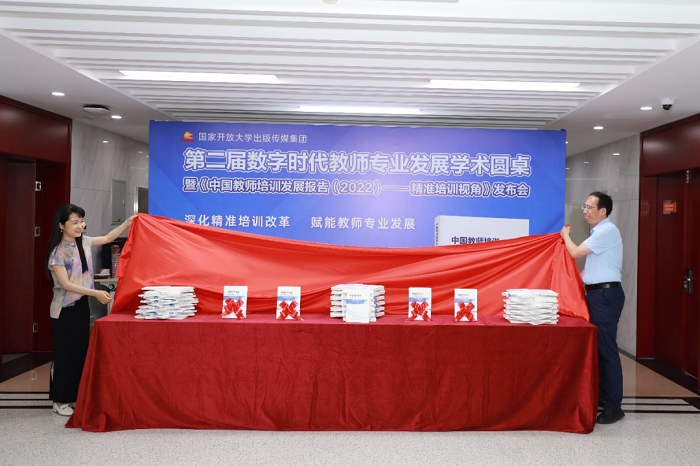 2023年6月17日,第二届数字时代教师专业发展学术圆桌暨《中国教师培训发展报告(2022)——精准培训视角》发布会在国家开放大学出版传媒集团举行,教师培训领域的政策制定者、学术研究者与实践探索者共聚一堂,深入探讨数字时代教师精准培训改革的政策导向、理论建构与实践探索,为教育数字化背景下我国教师精准培训改革建言献策。在教育系统全面贯彻党的二十大精神、学习贯彻习近平总书记在中共中央政治局第五次集体学习时的重要讲话精神之时,在深入开展主题教育、大兴调查研究之风、推进落实教育数字化战略行动之际,本次会议的召开可谓恰逢其时。来自北京师范大学、中国教育科学研究院等多家单位,学习强国、《中国教育报》等多家媒体的代表现场参会,14500余位教师培训领域同行在线观看了视频直播。