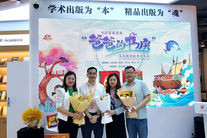 6月16日上午,南京大学出版社于2023年北京国际图书博览会举办江苏张家港“爸爸的书房”系列图书新书发布会。张家港市一直致力于创新开发本土文化创意产品,深入宣传城市文化品牌,同时大力扶持、推动本土全民阅读推广和文化创作、文艺生产。此次活动邀请了张家港市李忠影老师、赵宇老师两位嘉宾,现场分享、发布与南京大学出版社共同合作的“爸爸的书房”项目品牌和《沙洲往事》城市IP文化书。本次活动在淘宝天猫南京大学出版社旗舰店进行了同步直播,无法亲临现场的各位朋友也可以通过手机等电子设备云参与分享活动。