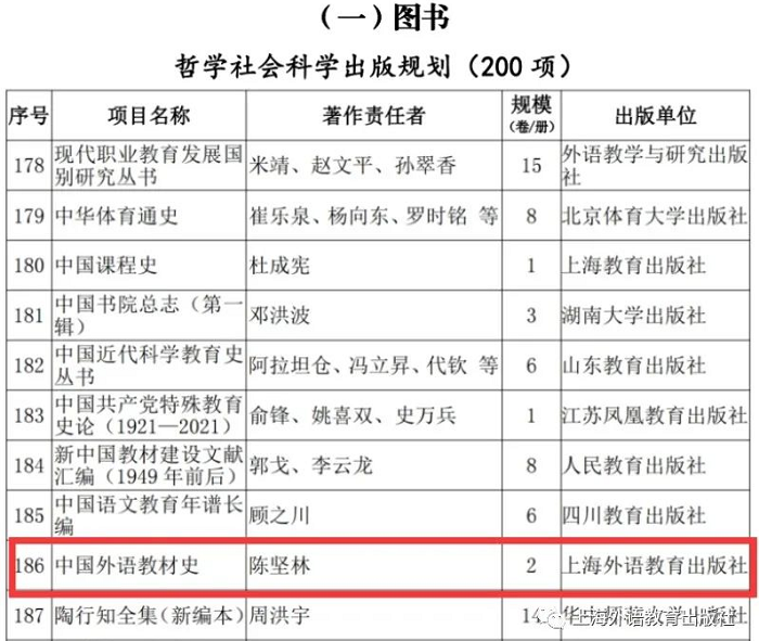 近日,国家新闻出版署公布“十四五”国家重点出版物出版规划调整情况,确定“十四五”国家重点出版物出版规划增补项目590个,其中图书出版项目512个、音像电子出版项目71个、数字出版项目7个。上海外语教育出版社《中国外语教材史》入选图书出版项目增补项目。
