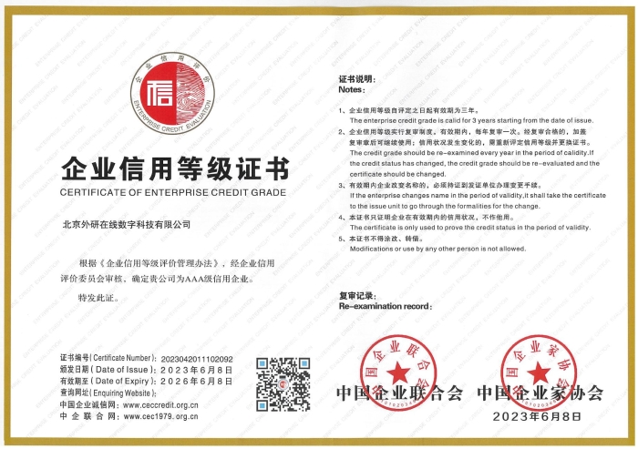 企业信用评价指标科学完善,过程严谨细致,通过信息比对和多维度综合评价,经过专家严格审核和网上公示。“AAA级信用企业”作为我国企业信用评级最高级别,是外研在线信用特征的集中体现,是履行商业合约和社会责任能力的反映,也是日常经营状况健康度的权威表达。荣誉的背后,是社会各界及权威机构对外研在线在完善品牌建设、引领行业发展和坚持诚信经营等方面工作成绩的充分肯定。