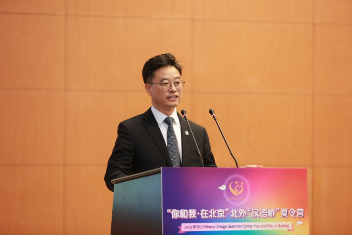 贾文键在致辞中提到,“你和我·在北京”是北外国际中文教育交流的传统项目和品牌项目,至今已走过十余年的光阴,累计接待来自世界各国的1000余名中文学习者来华研习,感受中文魅力,体验多彩北京,理解当代中国。他希望营员们能够通过夏令营期间丰富的语言实践课程、文化欣赏体验和多元文化交流活动,彼此了解,相互学习,建立友谊,日后成为不同文化之间的交流使者、不同文明之间的传播先锋、不同国家之间的友谊桥梁。