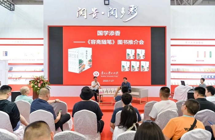 27日下午,作为贵州展团重要活动之一的“国学添香——《容斋随笔》(文白对照全本全译)图书推介会”由贵州大学出版社隆重推出。推介会由贵州大学出版社副社长龚晓康教授主持。贵州省委宣传部有关领导、贵州出版集团负责人、书博会贵州代表团成员及广大嘉宾学者等出席推介会。上海外国语大学教授、博士生导师,《容斋随笔》译注者杨四平对本套丛书作了推介,并围绕“品润国学经典 传承传统文化”主题讲述如何颂好中华典型、做好青少年文化阅读引领。会上还举行了《容斋随笔》(文白对照全本全译)大V现场直播、国学知识抢答、作者签名售书活动,场面极度活跃、气氛十分热烈,吸引了大量嘉宾驻足观看,各方媒体争相报道。