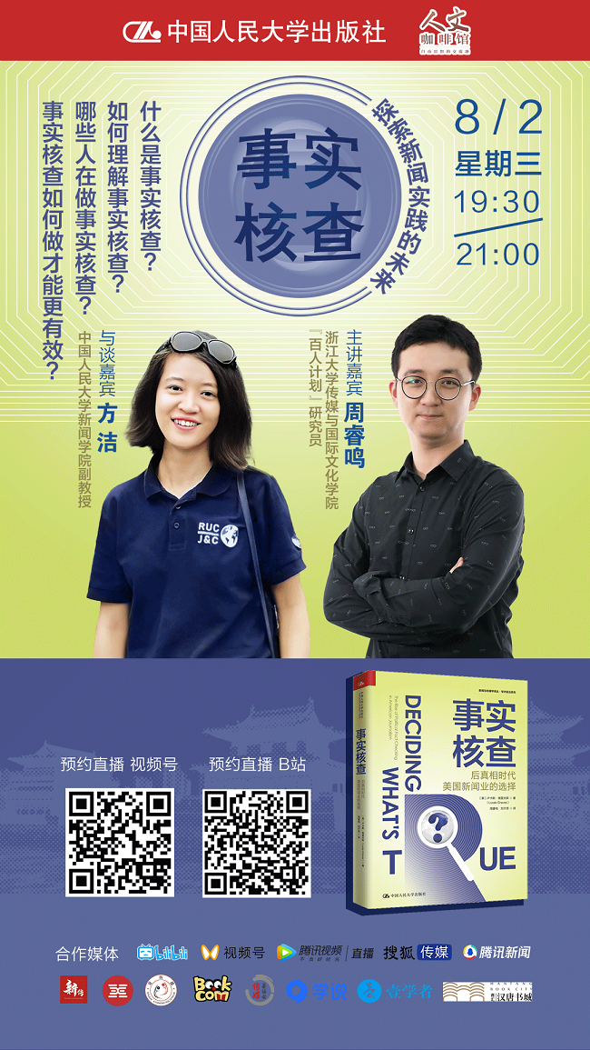 8月2日晚19:30,浙江大学传媒与国际文化学院“百人计划”研究员、《事实核查》一书译者周睿鸣,中国人民大学新闻学院副教授方洁,一起来聊一聊“事实核查”。