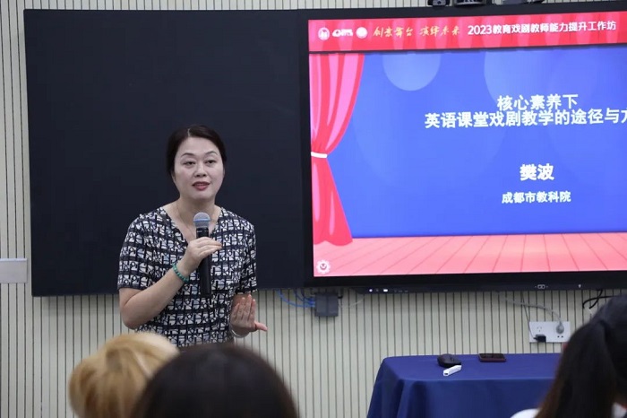 樊波首先阐述了戏剧活动多样化的教育功能,戏剧有利于学生的身心成长和智力发展,能有效地培养他们的社会合作能力。接着,她指出,在英语语言教育中,戏剧在语言的意义、运用和理解方面有天然优势。戏剧活动能够激活学生的内在动机和情绪,帮助学生在特定语境和情景中,通过排练和展演真正地内化语言。最后,樊波结合成都市戏剧教学的探索实例,分享了英语课堂戏剧教学的方法和途径,为老师们更好地在戏剧教学中落实英语学科育人价值提供了参考。