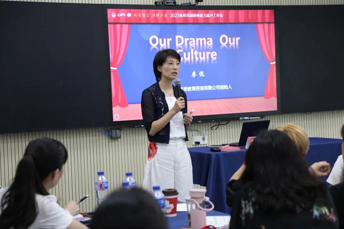 李悦分享了爱万奇在双语戏剧活动开展方面丰富的经验,如教师系列培训、课后服务戏剧课程搭建、戏剧工作坊和以戏剧为载体的校内外活动设计、校园戏剧活动开展和线上戏剧课程研发等。通过精彩的活动展示,带领老师们感受戏剧的魅力,了解戏剧走进校园的多种可能性。她结合案例展示了如何以英语剧本为载体,以戏剧为展现形式,引导学生感悟中华优秀传统文化,让文化自信扎根学生心灵。