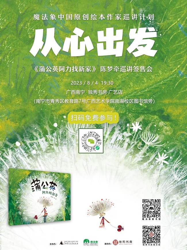 8月4日19:30,《蒲公英阿力找新家》作者陈梦牵将来到南宁,作客独秀书房·广艺店,与大朋友、小朋友们一同结识蒲公英小伙伴们,并为小小蒲公英阿力找新家!