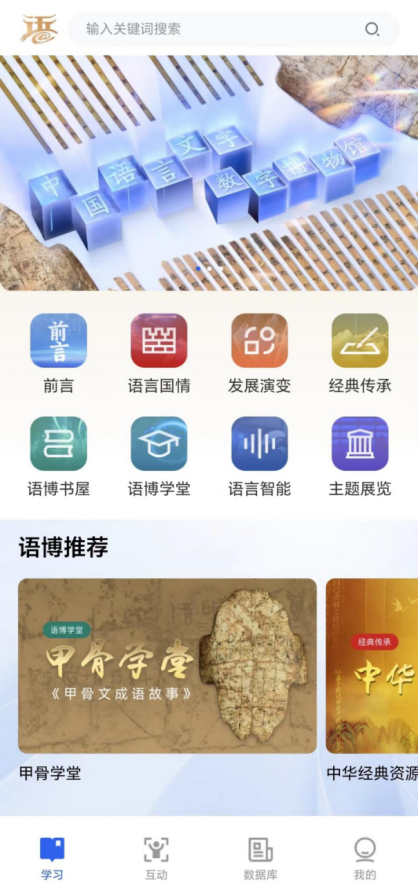 “语博”App是在语博网站基础上进行的适配拓展,风格界面与网站一致,资源保持总体不变,实现网页端—手机端同步同频。在版块设置上,App承续网站版块设置,设有语言国情、发展演变、经典传承、语博书屋、语博学堂、语言智能、主题展览7个资源版块,目前共有2000余条数字化资源。在功能应用上,根据用户特点及资源内容,设置“学习”“互动”“数据库”三个模块,与7个资源版块实现资源横纵交叉、立体展示,新增“了不起的甲骨文”等交互式、游戏化项目,方便用户轻松学习语言文化知识、有趣体验语言智能成果。在个性化服务上,通过“我的”模块进入个人中心,与国家智慧教育平台打通登录,记录学习足迹、积累学习积分、收藏学习资源,满足用户多元、个性需求。此外,App主页面还设置了专题活动运营区,近年来社会各界踊跃参与的“中华经典诵写讲大赛”活动在这一区域展示。