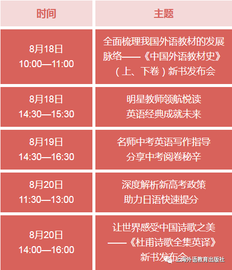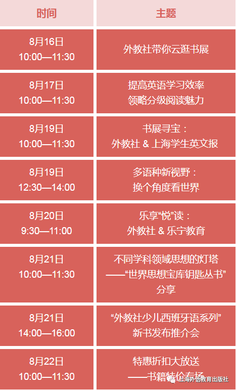线上活动 外教社在展位上搭建了直播间,将邀请名家和大咖们和广大读者进行线上亲密互动。另外,上海外语教育出版社还策划了丰富的在线直播活动,让不能亲临现场的读者也不留遗憾。届时将有特惠折扣大放送!
