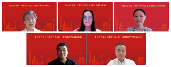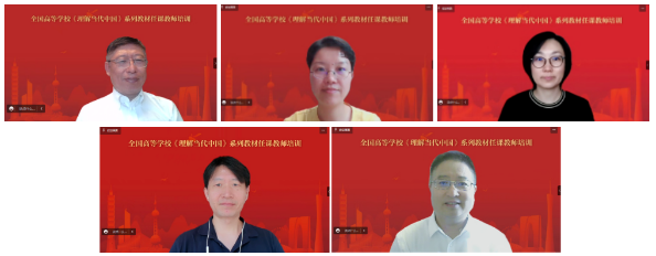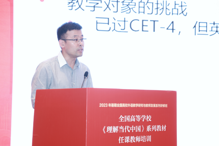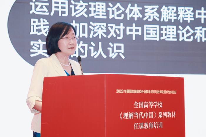 为帮助任课教师深入学习领会“习近平新时代中国特色社会主义思想”相关专题内涵,进一步把握《理解当代中国》系列教材内容,培训特别设置专题讲解环节,7位发言人分别基于《理解当代中国》系列教材内容,结合不同课程教学特点,就“以人民为中心”“中国特色大国外交”“教育强国”“文化自信与文化建设”“全过程人民民主”和“依法治国”等主题进行讲解,就服务国际传播能力建设的外语人才评价模式进行分享。