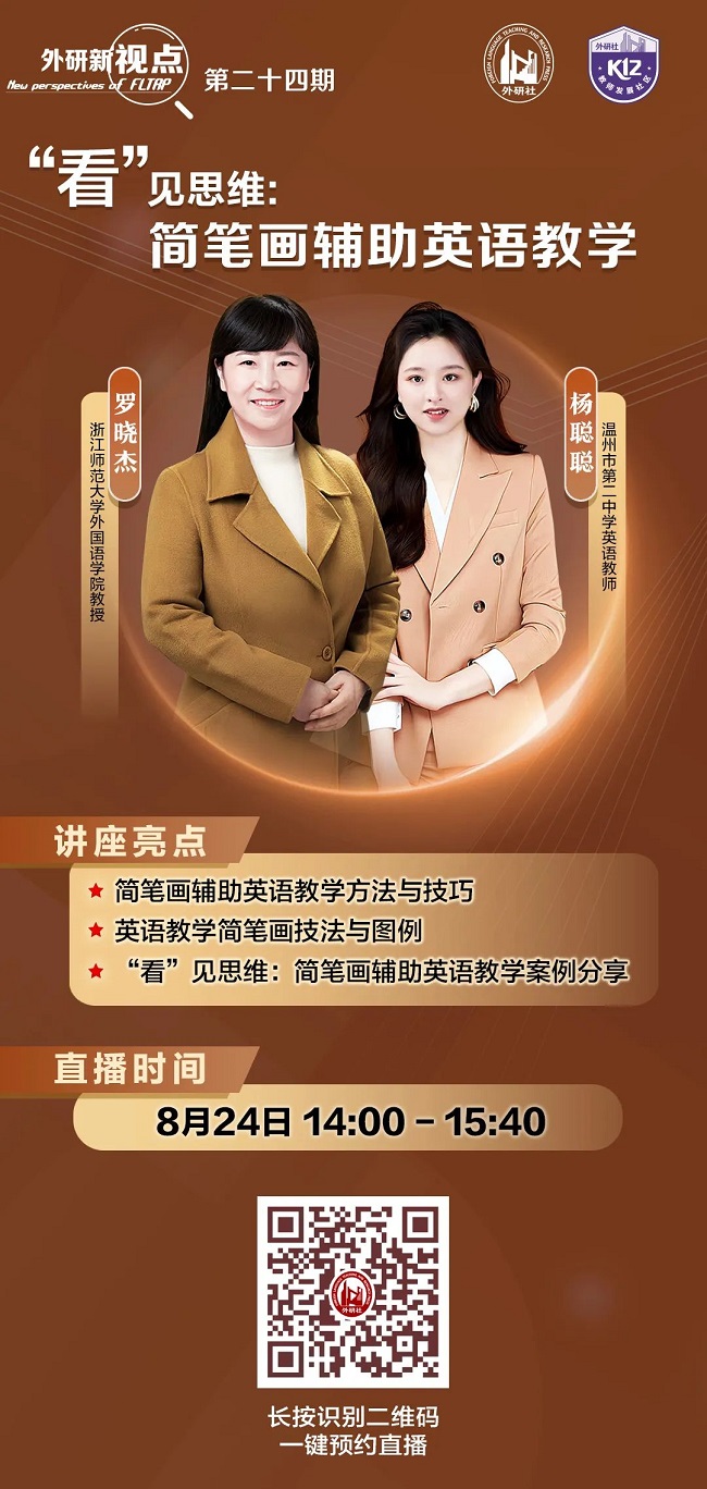 为了帮助广大中小学英语教师,运用简笔画设计教学活动和辅助课堂教学,8月24日下午14:00-15:40,第24期“外研新视点”直播将以“‘看’见思维:简笔画辅助英语教学”为主题,邀请浙江师范大学外国语学院教授罗晓杰和温州市第二中学英语教师杨聪聪做客直播间,两位老师将通过案例分析指导师范英语专业学生和一线英语教师如何有效利用简笔画进行英语教学,同步发展学生的英语语言能力与思维品质。欢迎关注并预约本场直播!