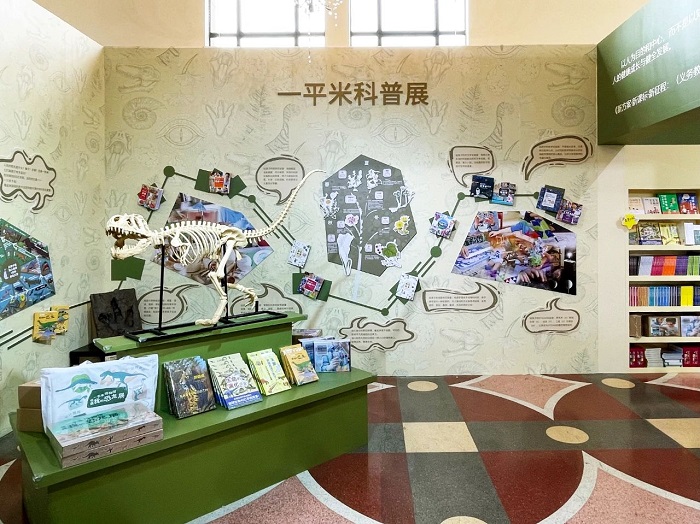 学前少儿区巧用“一平米”概念布置“一平米恐龙展、一平米科普展”,现场展出的仿真恐龙骨架模型、复刻的恐龙脚印化石、恐龙人形玩偶等吸引了众多小朋友。