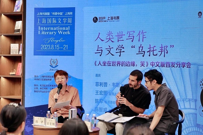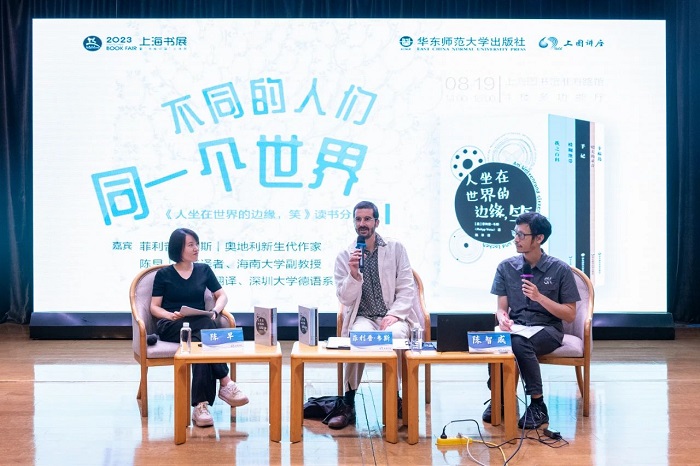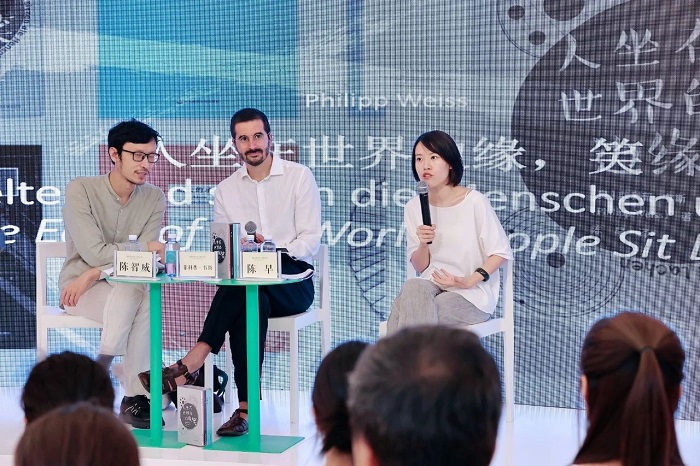 8月19日—20日,菲利普·韦斯、陈早、陈智威在上海图书馆、思南文学之家、西一馆圆厅分享新书《人坐在世界的边缘,笑》(图源2023上海国际文学周)。