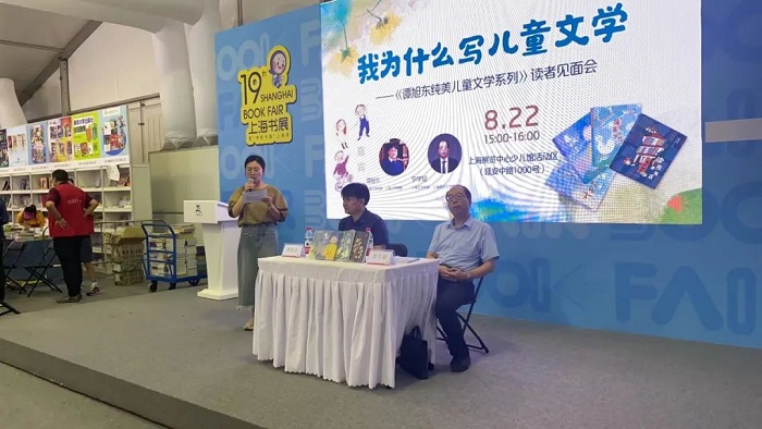 8月22日,谭旭东、李学斌在少儿馆活动区分享“谭旭东纯美儿童文学系列”。