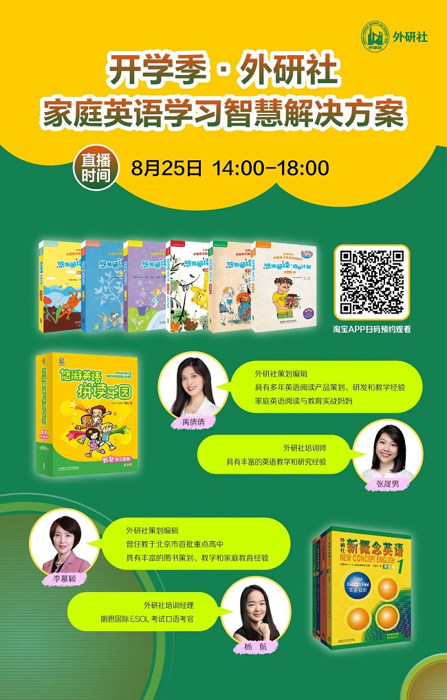 8月25日下午2点到6点,外研社策划编辑禹倩倩、李慕颖和外研社培训师张晟男、杨航将做客直播间,从《悠游英语拼读乐园智慧学习套装》《悠游阅读·成长计划》到《新概念英语智慧版》,从自然拼读到分级阅读,再到综合性英语学习,与家长探讨英语学习各个阶段的学习重点和学习方法,帮助家长和孩子充分利用纸数深度融合的优质图书,开启智慧学习之旅,让孩子乐学、爱学,让家长省心、放心。