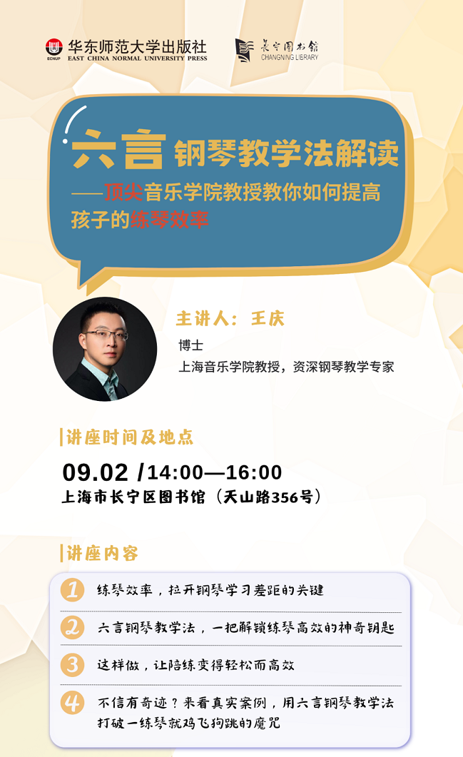 9月2日14:00,王庆教授将在上海市长宁区图书馆跟大家见面,他将结合孩子练琴时的常见问题介绍“六言钢琴教学法”和“六言钢琴教学法”的使用方法,并将对现场表演的小琴童进行指导。