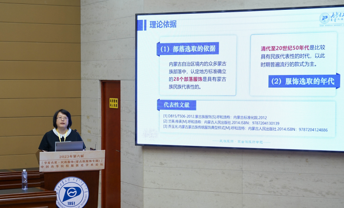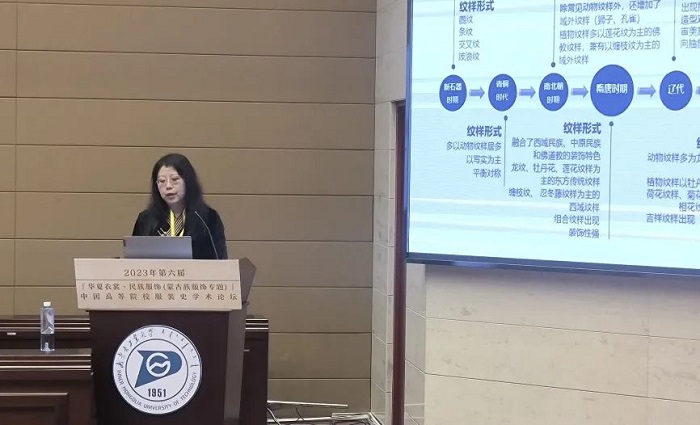 内蒙古工业大学轻工与纺织学院史慧教授发言的主题是“蒙古袍形制及其传统装饰工艺研究”。她认为,蒙古袍与中华传统袍服形制一脉相承,不仅形成了鲜明的民族特色,也演绎出具有地域差异的内部多样性,是中华传统服饰形制一体多元的生动体现。史教授说,蒙古袍是蒙古族人民长期实践的智慧结晶,所展现的艺术特征和审美价值具有显著的文化属性,所体现出的思想感情、风俗习惯和审美观念是文化价值的核心,也是研究蒙古族服饰文化本质的重要依据。研究蒙古袍形制的多样性成因,分析传统装饰工艺的构成、应用组合规律,探索其数字可视化路径,可为传统装饰工艺数字可视化传承提供数据和解决方案。