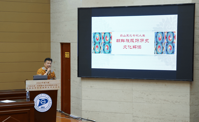 青岛大学张成义教授发言的主题是“白山黑水七彩人生——中国朝鲜族七彩衣研究”。他聚焦朝鲜族服饰研究,他讲到,朝鲜族服饰不仅具有独特的民族特征,还拥有深厚的文化背景。朝鲜族特色七彩衣可以折射出朝鲜族的思想文化,对朝鲜族七彩衣进行研究有助于促进我国少数民族服饰元素与现代审美取向的融合,使朝鲜族民族艺术向多元化和个性化方向发展,对朝鲜族服饰的本土文化语言由静态的非物质文化遗产转化为动态的社会资源有积极作用。