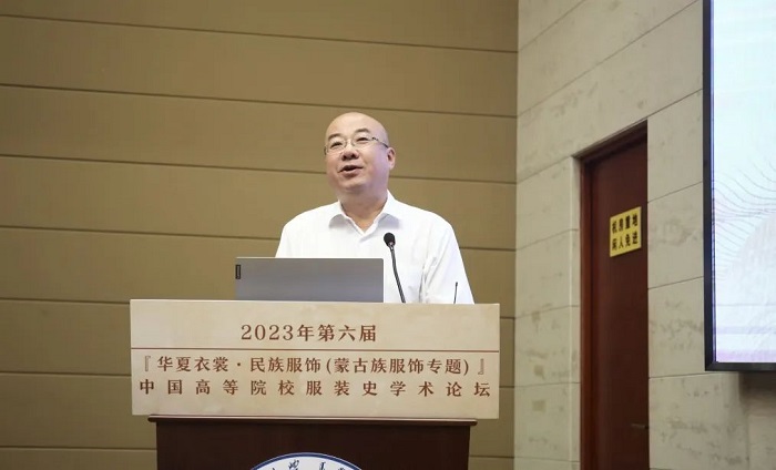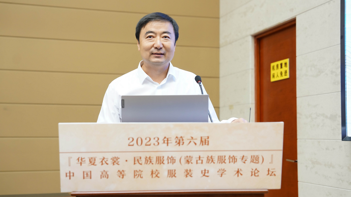 内蒙古自治区艺术研究院、非遗保护中心培训部主任董小健在致辞中说到,内蒙古自治区连续举办了十七届内蒙古服装服饰文化艺术节,即内蒙古服饰大赛。多年来,艺术研究院致力于蒙古族服饰的数字化、历史资料的收集、整理和出版工作,也组织了多次专场展示,推动蒙古服饰对外交流,进行了一些探索,也取得了一些重要成果,增强了蒙古族服饰的传承活力,提高了服饰文化的可见度和影响力。希望通过本次论坛,有更多机会与各位专家学者进行交流合作,推动蒙古族服饰文化更好的保护和传承,为传承和弘扬中华优秀传统文化、打造文化品牌作贡献。