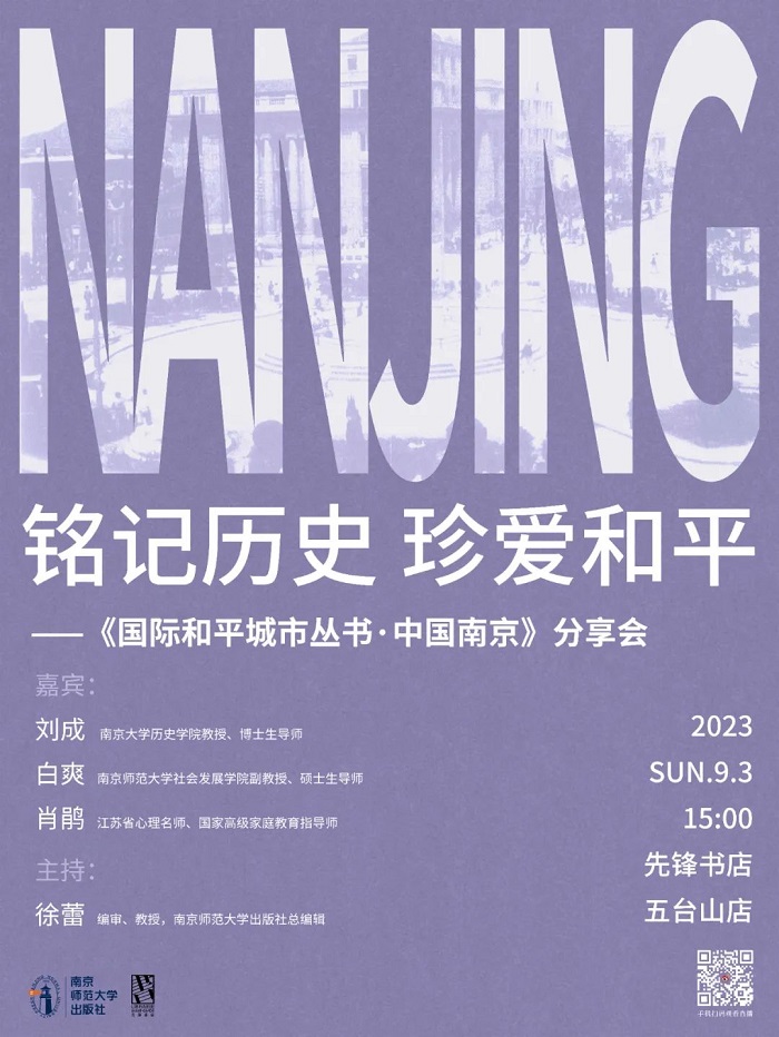 9月3日(周日)下午15:00,《国际和平城市丛书》主编刘成、《国际和平城市丛书·中国南京》作者白爽、江苏省心理名师肖鹃以及南京师范大学出版社总编辑徐蕾将做客南京先锋书店五台山总店,谈一谈和平与南京的前世今生以及这本书的台前幕后。