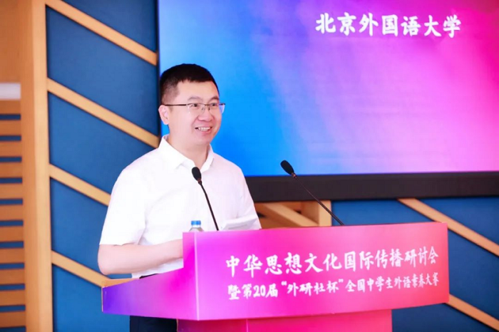 丁浩副校长在致辞中表示,北京外国语大学服务国家战略,响应时代需求,凝聚学科优势,持续挖掘“全球语言、全球文化、全球治理”的领域资源,致力于培养“有家国情怀、有全球视野、有专业本领”的复合型人才,承担“中华思想文化术语传播工程”等多个国家重大项目,积极推动国际传播能力建设,支持构建新时代中国对外话语体系,为中国参与全球治理贡献力量。他希望“外研社杯”全国中学生外语素养大赛与中华思想文化术语的结合,能够加深青少年对中华传统思想文化的理解,提升青少年用外语讲好中国故事的素养。
