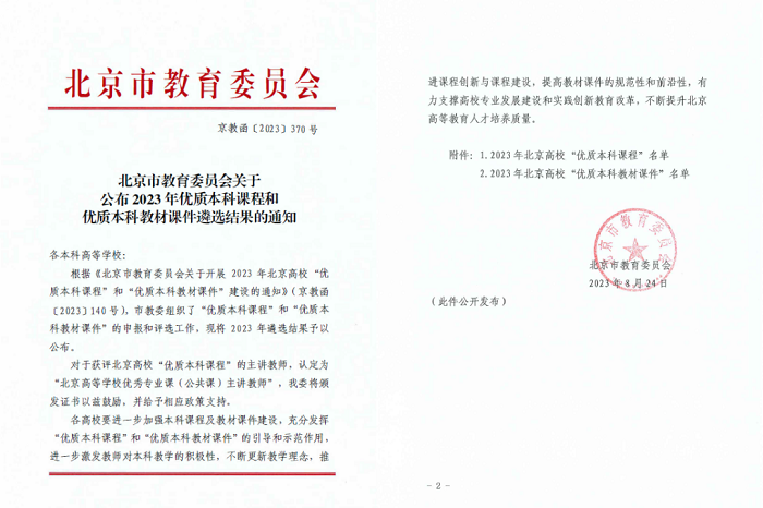 近日,北京市教育委员会(以下简称“北京市教委”)发布《关于公布2023年“优质本科课程”和“优质本科教材课件”遴选结果的通知》 (京教函〔2023〕370号)公布了本年度北京高校“优质本科课程”和“优质本科教材课件”项目名单。