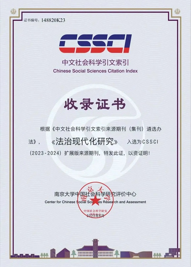 近日,南京师范大学收到南京大学中国社会科学研究评价中心《收录证书》。根据《中文社会科学引文索引来源期刊(集刊)遴选办法》,南京师范大学与江苏省法学会共同主办的《法治现代化研究》入选中文社会科学引文索引(CSSCI)(2023-2024)扩展版来源期刊。这是《法治现代化研究》首次入选CSSCI扩展版来源期刊。