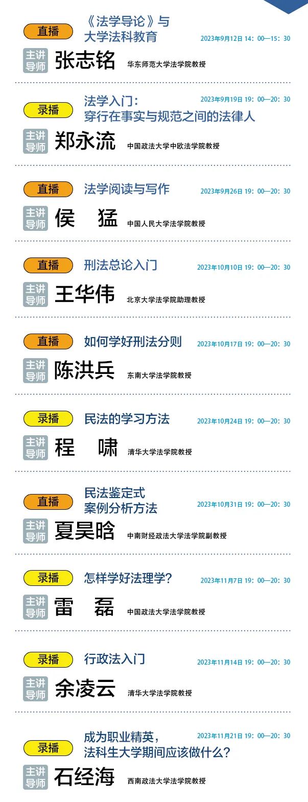 2023年9月-11月,全国高校“法科生成长计划”系列公益公开课将进行第二季十场课程播放,授课采取线上直播或录播形式。