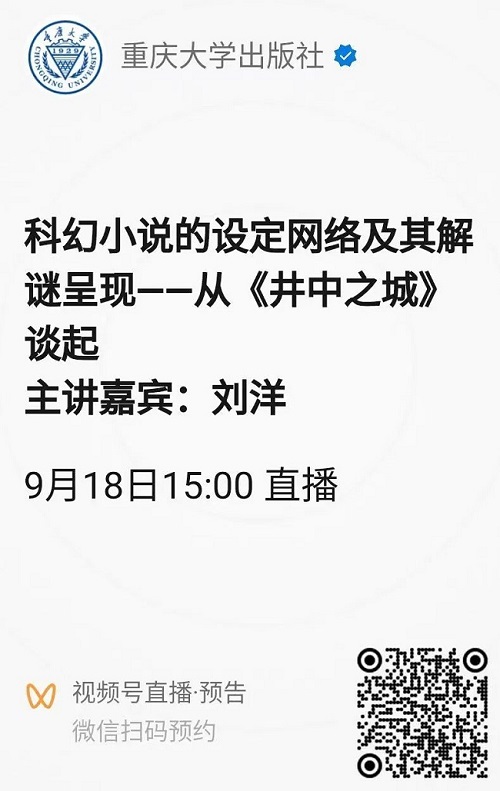 2.扫描下方二维码,关注重庆大学出版社视频号,可预约线上观看。