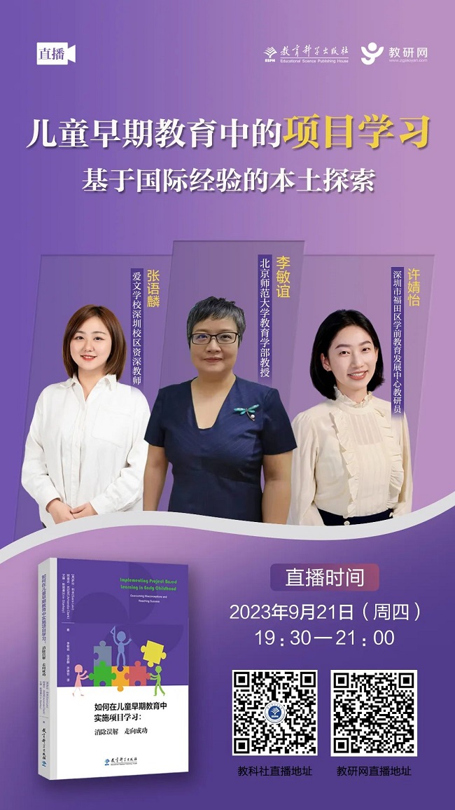 项目学习之风也从基础教育阶段传到了幼儿教育阶段。很多幼儿园正在开展项目学习的研究,还有很多幼儿园想要开展这项研究。为了帮助广大学前教育工作者更好地掌握低龄儿童项目学习的理念与实施方法,了解项目学习的内涵、特征以及最新的研究进展,共同研究促进项目学习的优秀实践案例,推动项目学习在学前教育实践中的应用,教育科学出版社和教研网将举办“名家·名师面对面”系列活动第26期,邀请国内学前教育领域的知名专家以及一线教师、教研员,与广大一线学前教育工作者共同探讨项目学习在幼儿园中的落地、实施,帮助幼儿提升课程质量。