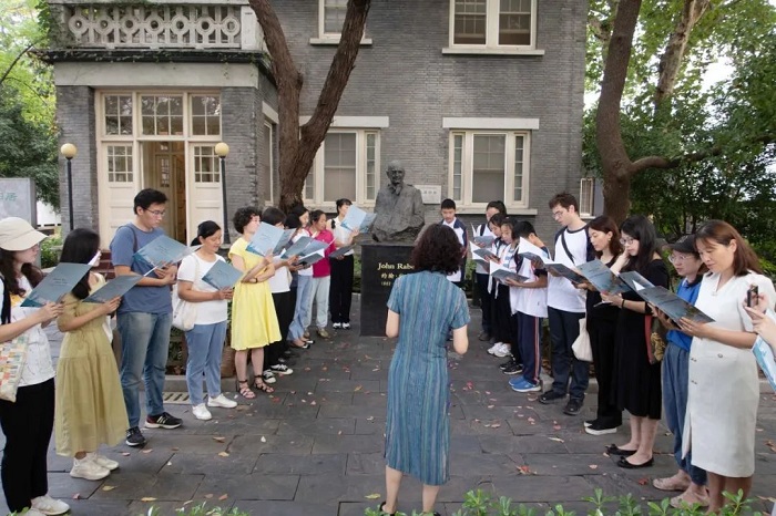 9月的阳光清澈、和煦,南京市广州路小粉桥1号,迎来一群特别的参观者,中学生、教师、护士、留学生……素不相识的他们聚在一起,在拉贝先生的雕像前共读《拉贝日记》,和平之音掷地有声。