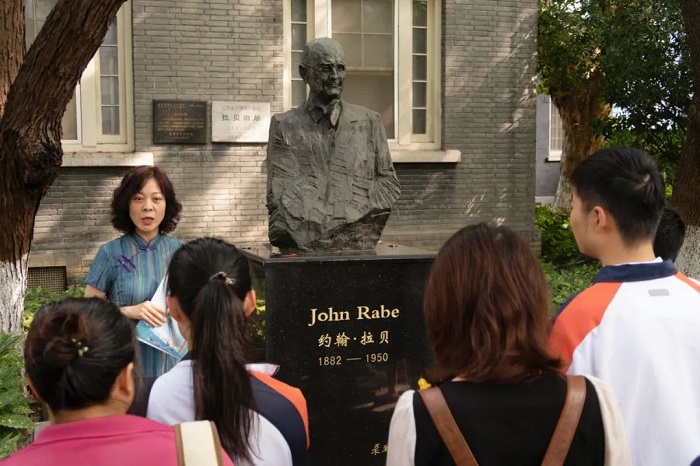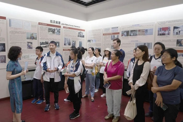 现场,紫金草国际和平学校“行前一课”讲师团成员、南京外国语学校英语教师尚媛媛带领大家参观了拉贝纪念馆,她从早年拉贝的生活经历、拉贝的中国之旅、南京安全区的建立、南京大屠杀期间安全区国际委员会成员的努力和付出、拉贝回到德国以及《拉贝日记》的出版和巨大反响等方面给大家作了详细的介绍。