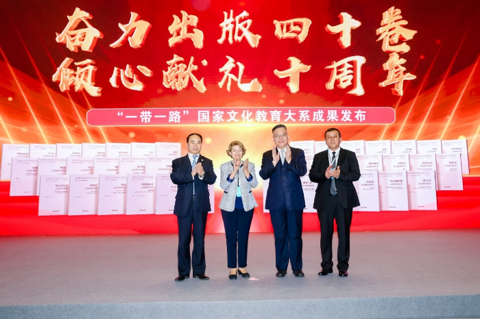 2023年是习近平主席提出“一带一路”倡议十周年。9月16日,“一带一路”国家文化教育大系(以下简称“文化教育大系”)成果发布仪式在北京外国语大学(以下简称“北外”)主办的“全球文明论坛”上隆重举行,以四十卷恢弘巨著为“一带一路”倡议十周年献礼,为北外八十二华诞庆生。中共中央对外联络部副部长郭业洲,联合国教科文组织前总干事伊琳娜•博科娃,北京外国语大学党委书记、文化教育大系总主编王定华,乌兹别克斯坦国立世界语言大学执行校长库尔玛托夫·巴赫罗姆·古利亚莫维奇共同为文化教育大系四十卷出版成果揭幕。现场六百余名专家、学者和嘉宾参加了发布仪式,来自181个国家的全球区域国别学共同体成员、全球外国语大学联盟高校线上参会。