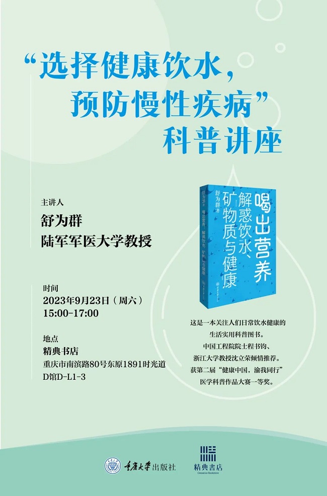 9月23日(周六)下午15:00,陆军军医大学(第三军医大学)舒为群教授将携新书《喝出营养:解惑饮水、矿物质与健康》在精典书店与大家见面,以“饮用水、平衡膳食与健康”为主题分享关于日常饮水的健康知识。