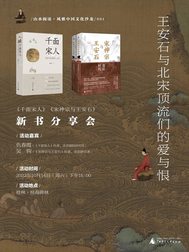10月14日星期六下午3点,广西师范大学出版社山水阅读节活动首秀,邀请到著名的宋史畅销书作家、《宋神宗与王安石:变法时代》作者吴钩老师,与中国美院研究院研究员、《千面宋人:传世书信里的士大夫》作者仇春霞老师,在桂海碑林一起聊聊王安石与这些北宋顶流们的爱与恨。让我们从这些人的经历或故事中,重新发现宋朝,感受大宋文明。