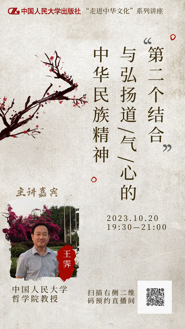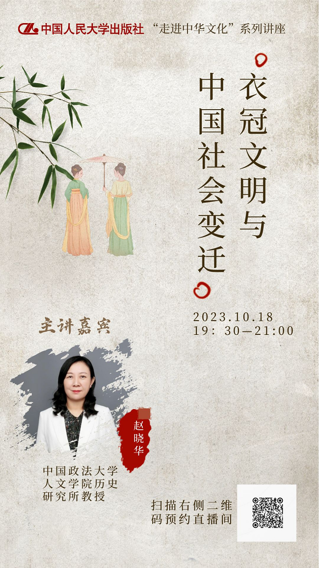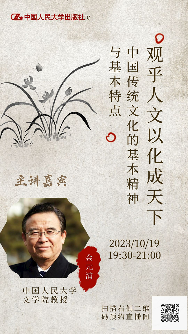 中国人民在千百年来的生产生活中创造的中华文明,既是中国人共同守望的“根”,也是共同塑造的“魂”。赓续中华文脉,传承文化基因是我们共同的历史使命。2023年10月18日至20日,中国人民大学出版社特别邀请了来自中国人民大学、中国政法大学的三位学者,为大家带来“走进中华文化”系列讲座。快来扫描图片二维码,预约直播吧!