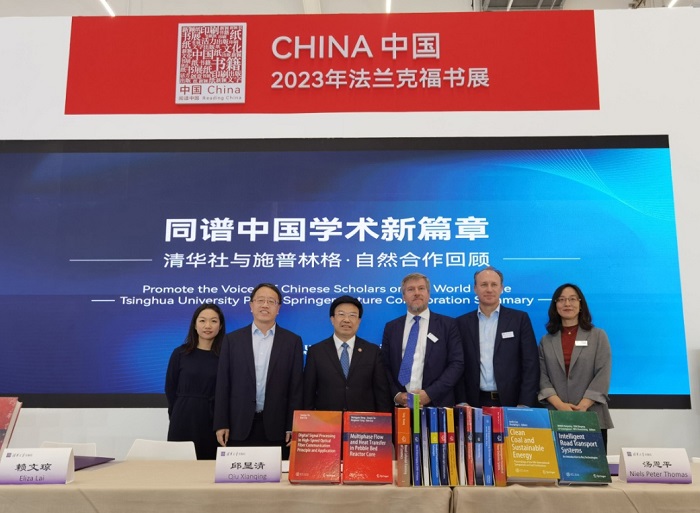 2023年10月18日,在第75届法兰克福国际书展上,清华大学出版社与施普林格·自然集团在中国出版联合展台活动区举办“同谱中国学术新篇章”英文学术图书合作成果展示活动。
