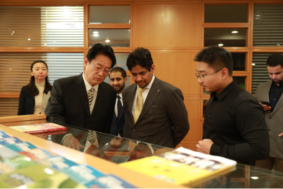 会谈前,刘捷常务副社长陪同代表团一行参观了外研社图书展区,介绍了外研社在国际中文和阿拉伯语领域出版的精品教材、读物、工具书等,特别是专为阿拉伯国家开发的《手拉手》《你真棒》中文教材以及在海外市场产生较好影响力的《中华思想文化术语》《中国故事》《中国文化读本》等中国主题文化类图书。外研社国际合作部主任邵磊、中国语言文化出版分社社长鞠慧、综合语种教育出版分社社长崔岚等一同参加会见。