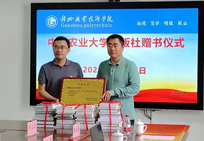 座谈会后举行了图书捐赠仪式,董夫才代表中国农业大学出版社向赣州职业技术学院无偿捐赠1070册图书,温学延代表学院全体师生向出版社赠送荣誉证书并表示感谢。