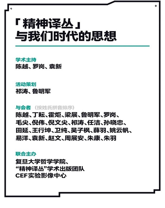 自“精神译丛”面世以来,丛书将当代思想中最有力量和价值、并为国内学界和读者期待已久的经典作品,不断加以译介,聚沙成塔,蔚为大观。如今也引起了中国知识界与思想界越来越多的关注。近年来,“精神译丛”更是陆续推出了阿尔都塞、德里达、奈格里、马舍雷等若干重量级译著,今年更有经典著作问世。基于此,由复旦大学哲学学院、“精神译丛”学术出版团队、CEF实验影像中心共同主办“精神译丛”与我们时代的思想研讨会,在无央公园(chi K11美术馆)进行,会议进一步讨论“精神译丛”丛书的思想译介与传播。