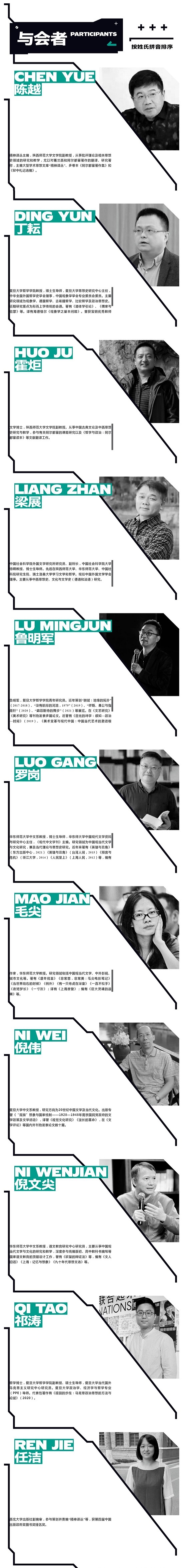 罗岗(华东师范大学中文系)毛尖(华东师范大学)倪文尖(华东师范大学中文系)孙晓忠(华东师范大学中文系)朱羽(上海大学中文系)朱康(华东师范大学国际汉语文化学院)