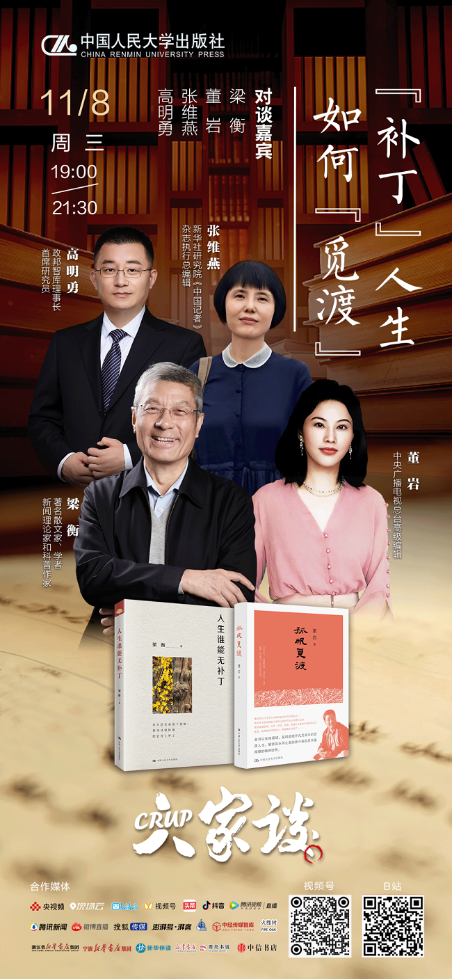 11月8日是中国记者节,是新闻人的节日。中国著名新闻理论家、原新闻出版署副署长梁衡先生和他在新闻界的三位好友,就从已出版的两本新书说起,谈创作,话人生。由一个人的故事,去看一代人的经历,思考人生能否无“补丁”,人生如何打“补丁”,在人生的渡口,如何觅到船、看到光。