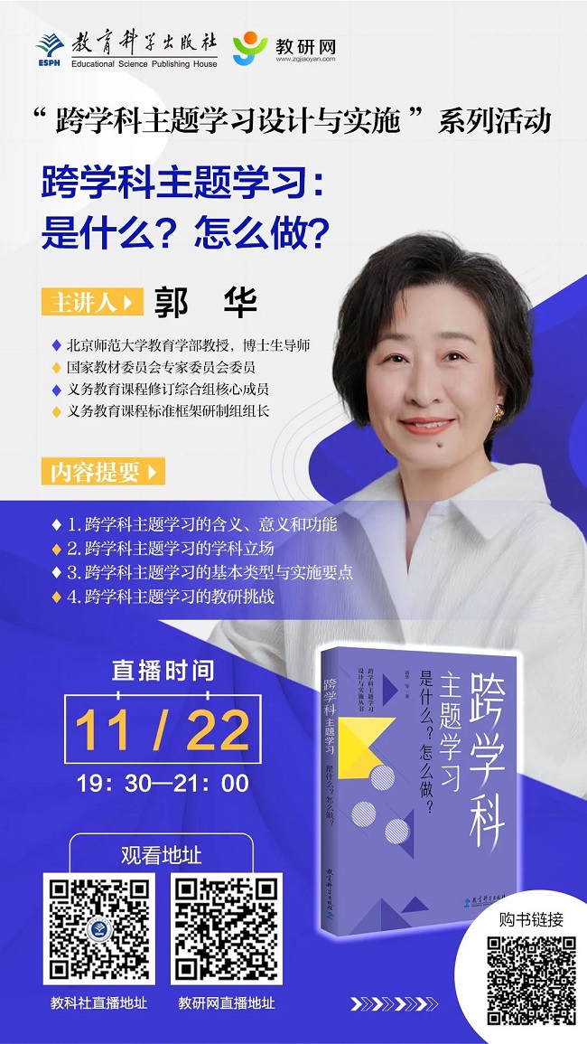 11月22日晚7点半,将举办系列活动的最后一场,邀请义务教育课程修订综合组核心成员、义务教育课程标准框架研制组组长,北京师范大学郭华教授走进直播间,用严谨的学术思考和丰富的实践案例为老师们解读“跨学科主题学习:是什么?怎么做?”。