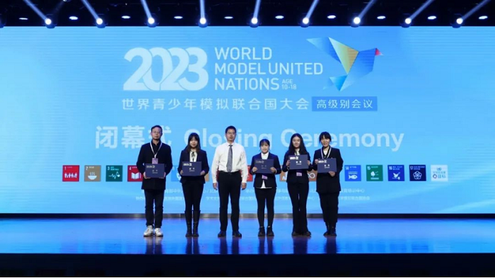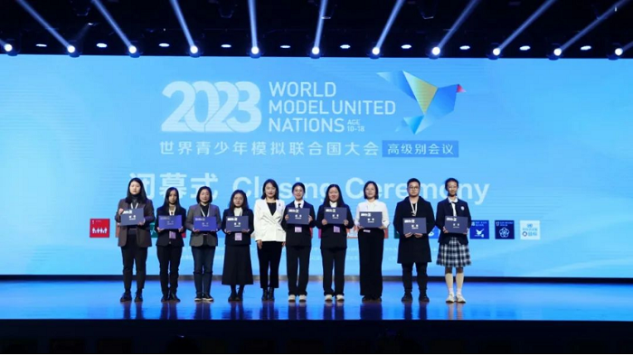 教育部中外人文交流中心机制二处处长陈滔伟、北京外国语大学外研社党委副书记陈媛媛、北京外国语大学教育培训中心总经理李国辉为获得优秀团队的学校颁发证书。大会还公布了优秀指导教师名单,感谢教师们对模拟联合国教育的付出。至此,2023世界青少年模拟联合国大会高级别会议圆满闭幕。