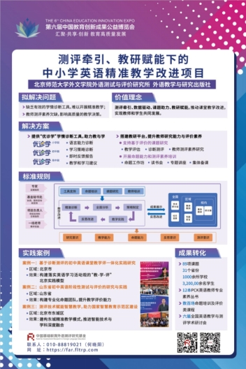 2023年11月18日至21日,外语教学与研究出版社和北京师范大学外语测试与评价研究所联合开展的“基于优诊学的教学改进项目”受邀参加第六届中国教育创新成果公益博览会,并以“测评牵引、教研赋能下的中小学英语精准教学改进项目”为题进行了专题展示。